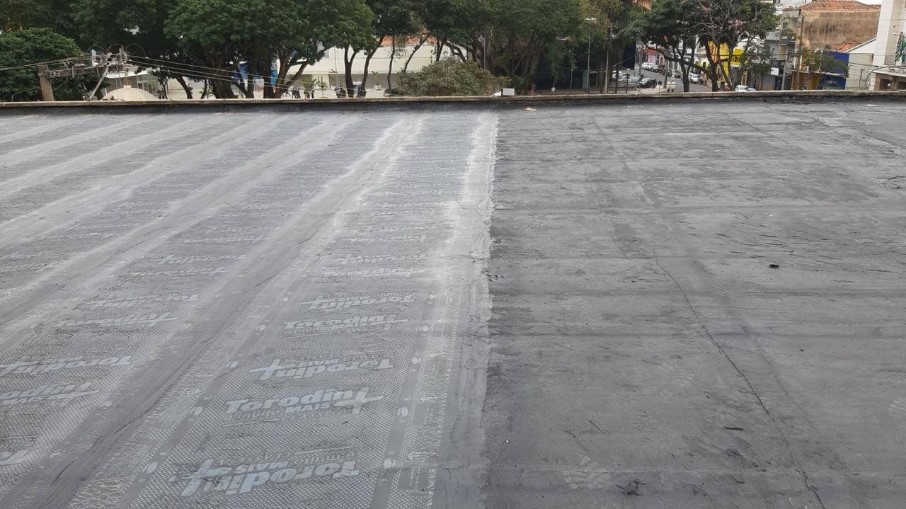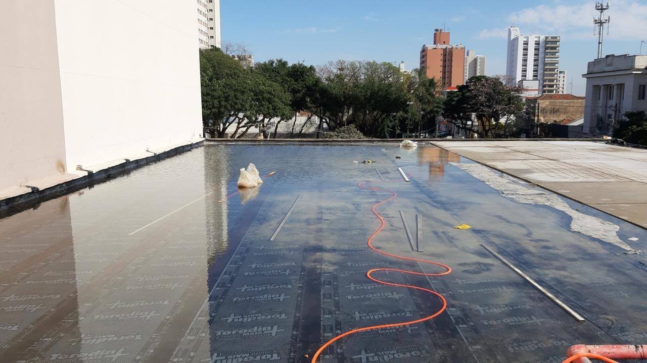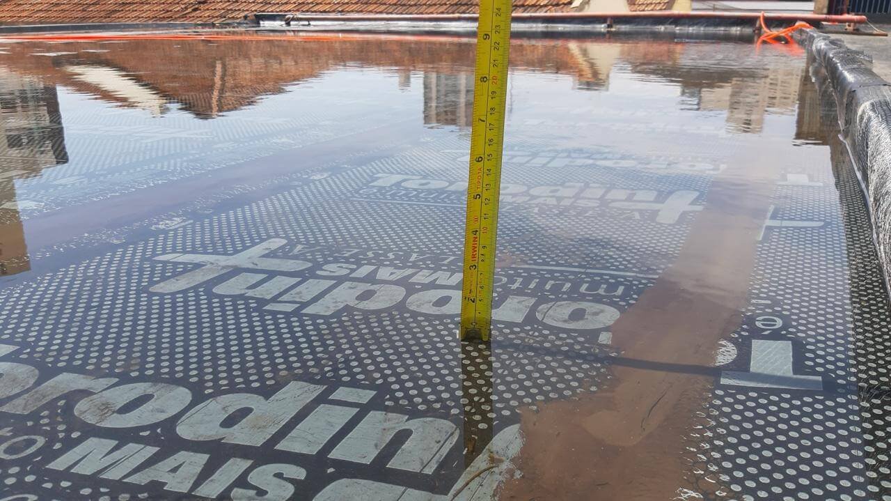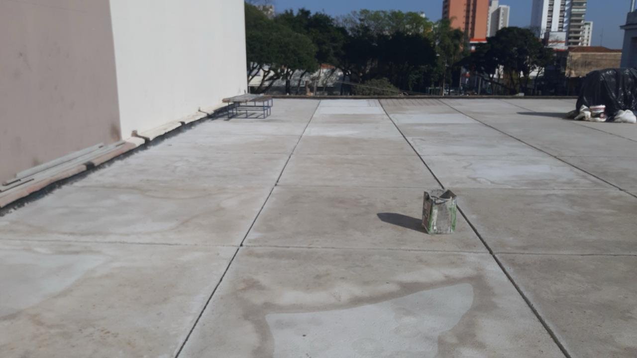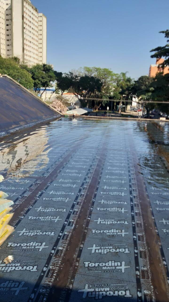 Realizamos a reforma completa do sistema de impermeabilização, iniciando com a demolição da proteção mecânica antiga e limpeza da área. O processo incluiu a correção da regularização da base com caimento para os ralos e aplicação de primer para a instalação da nova manta asfáltica. A vedação foi validada por testes de estanqueidade de 72 horas em etapas com lâmina d’água. Para finalizar, instalamos uma lona plástica como camada separadora, seguida por proteção mecânica estruturada com tela e executada em placas de 2 metros com juntas de dilatação para prevenir trincas.