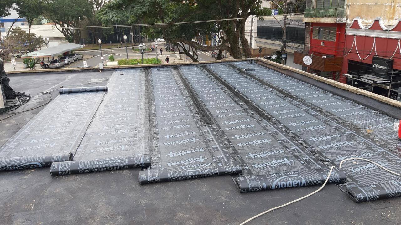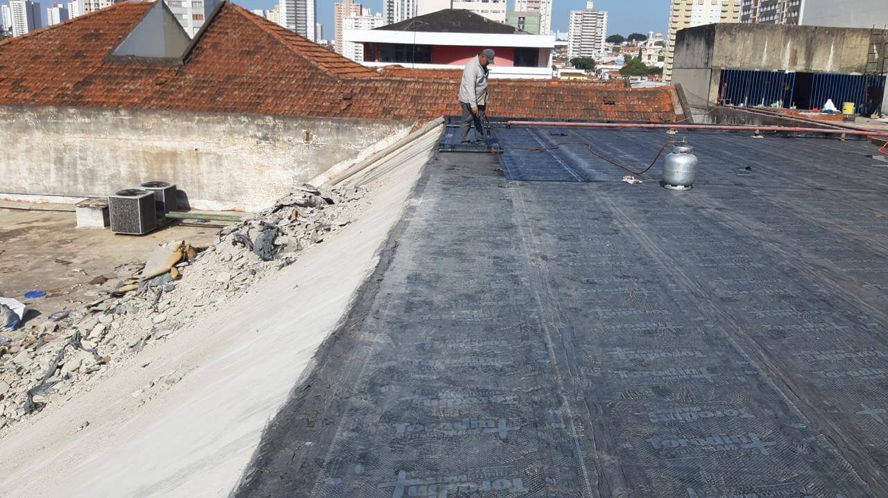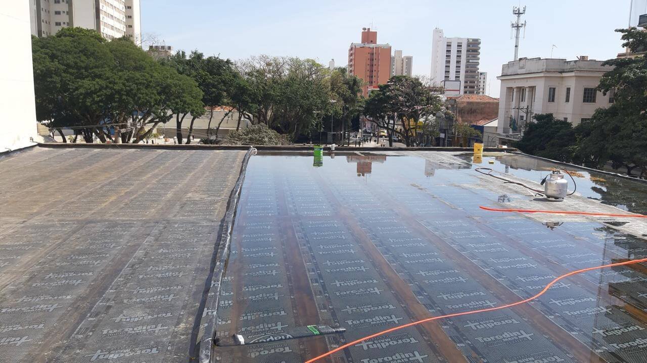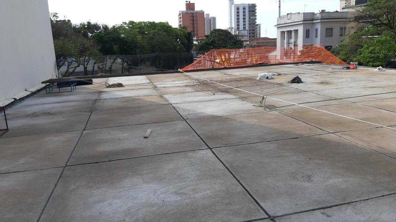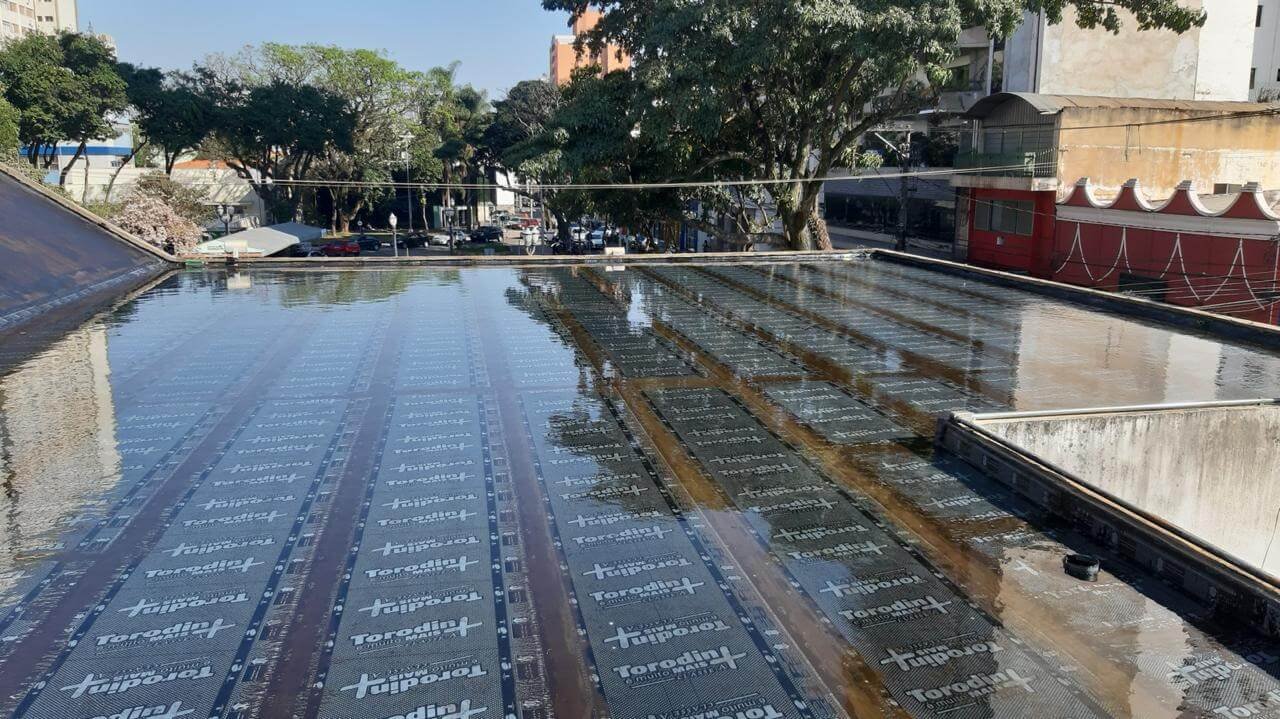 Realizamos a reforma completa do sistema de impermeabilização, iniciando com a demolição da proteção mecânica antiga e limpeza da área. O processo incluiu a correção da regularização da base com caimento para os ralos e aplicação de primer para a instalação da nova manta asfáltica. A vedação foi validada por testes de estanqueidade de 72 horas em etapas com lâmina d’água. Para finalizar, instalamos uma lona plástica como camada separadora, seguida por proteção mecânica estruturada com tela e executada em placas de 2 metros com juntas de dilatação para prevenir trincas.